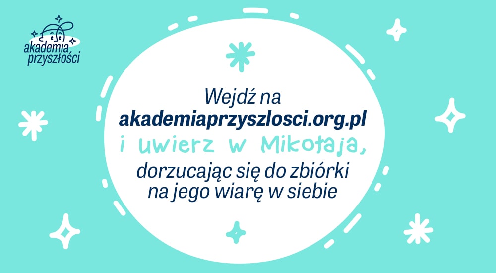 W Akademii Przyszłości krzyżują się drogi Dzieci, które nie wierzą w siebie i dorosłych, którzy chcą tę wiarę zbudować. Ich przygoda w Akademii jest jak podróż bez walizek, za to z pełnym sercem. Przeczytaj o Idze, Gabrysi, Zosi i Krysi. Z okazji Mikołajek Ty też możesz wyruszyć w wyjątkową podróż – tym razem na „mikołajowych saniach”. Ufunduj Indeks Sukcesów dla Dziecka z Akademii Przyszłości na www.akademiaprzyszlosci.org.pl.