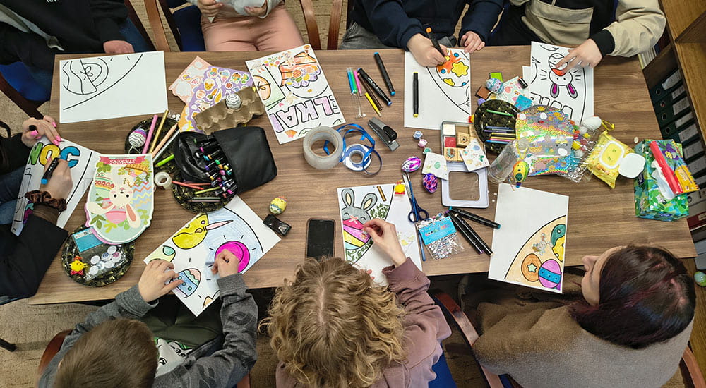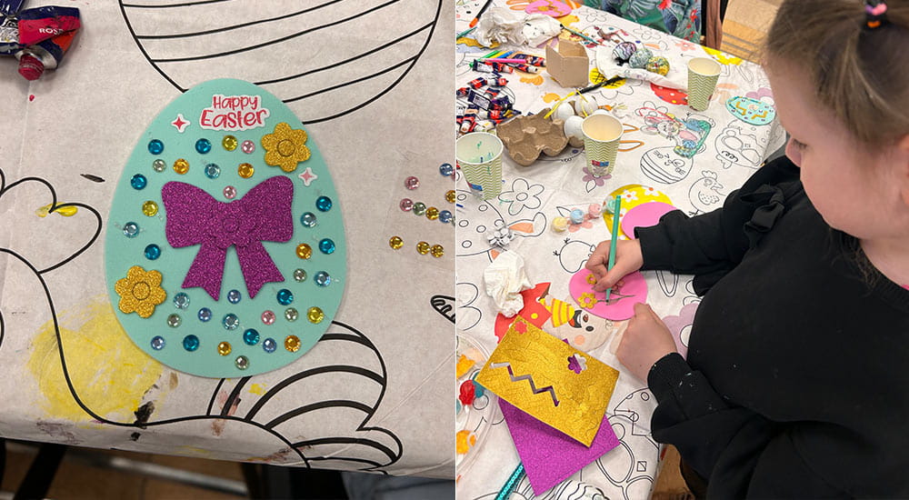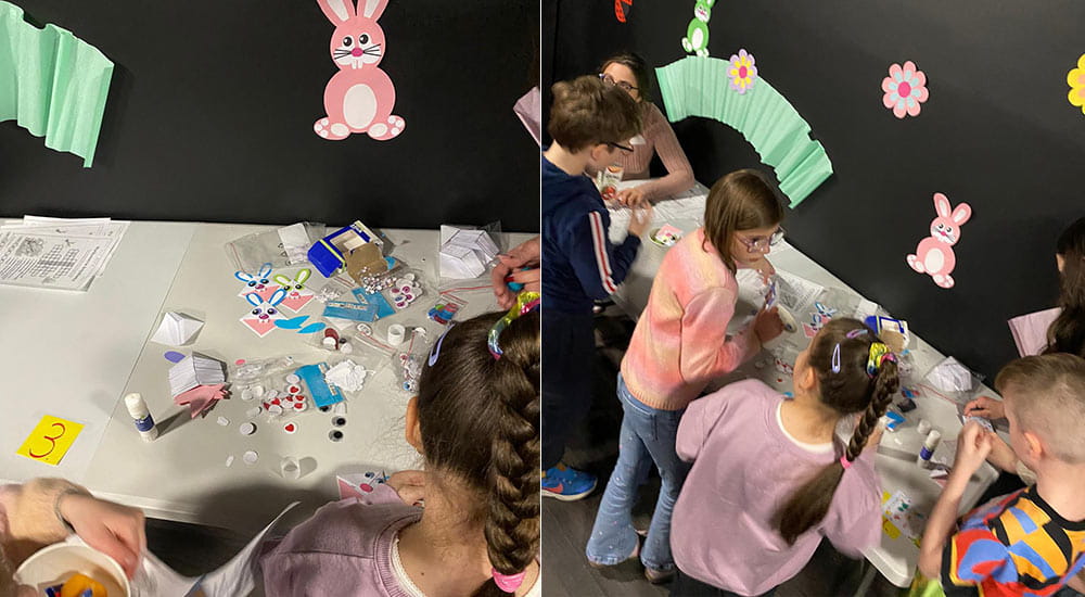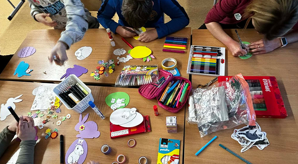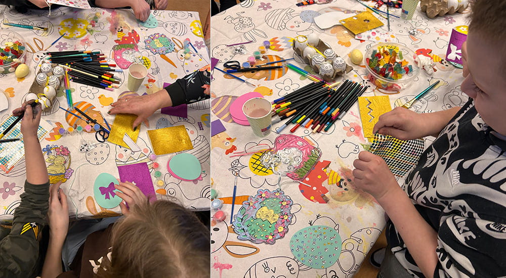W innym regionie Polski Dzieci wzięły udział w mini warsztatach artystycznych. Na początek tworzyły świąteczne witraże, pełne kolorów i wiosennych akcentów. Następnie z zaangażowaniem sklejały wielkanocne jajka z filcu, nadając im własny, niepowtarzalny charakter.