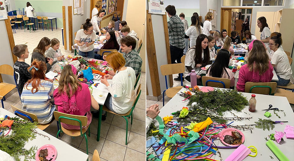Podczas wielkanocnego spotkania Dzieci z innej szkoły wzięły udział w różnorodnych aktywnościach, które łączyły kreatywność z ruchem i dobrą zabawą. Na początku czekały na nie warsztaty plastyczne – malowanie jajek na twardo, dekorowanie styropianowych pisanek wstążkami, tworzenie palm z naturalnych materiałów czy kolorowe wycinanki. Nie zabrakło także słodkiego akcentu – Dzieci z zaangażowaniem ozdabiały maślane ciasteczka, rozwijając przy tym swoją wyobraźnię i poczucie estetyki.